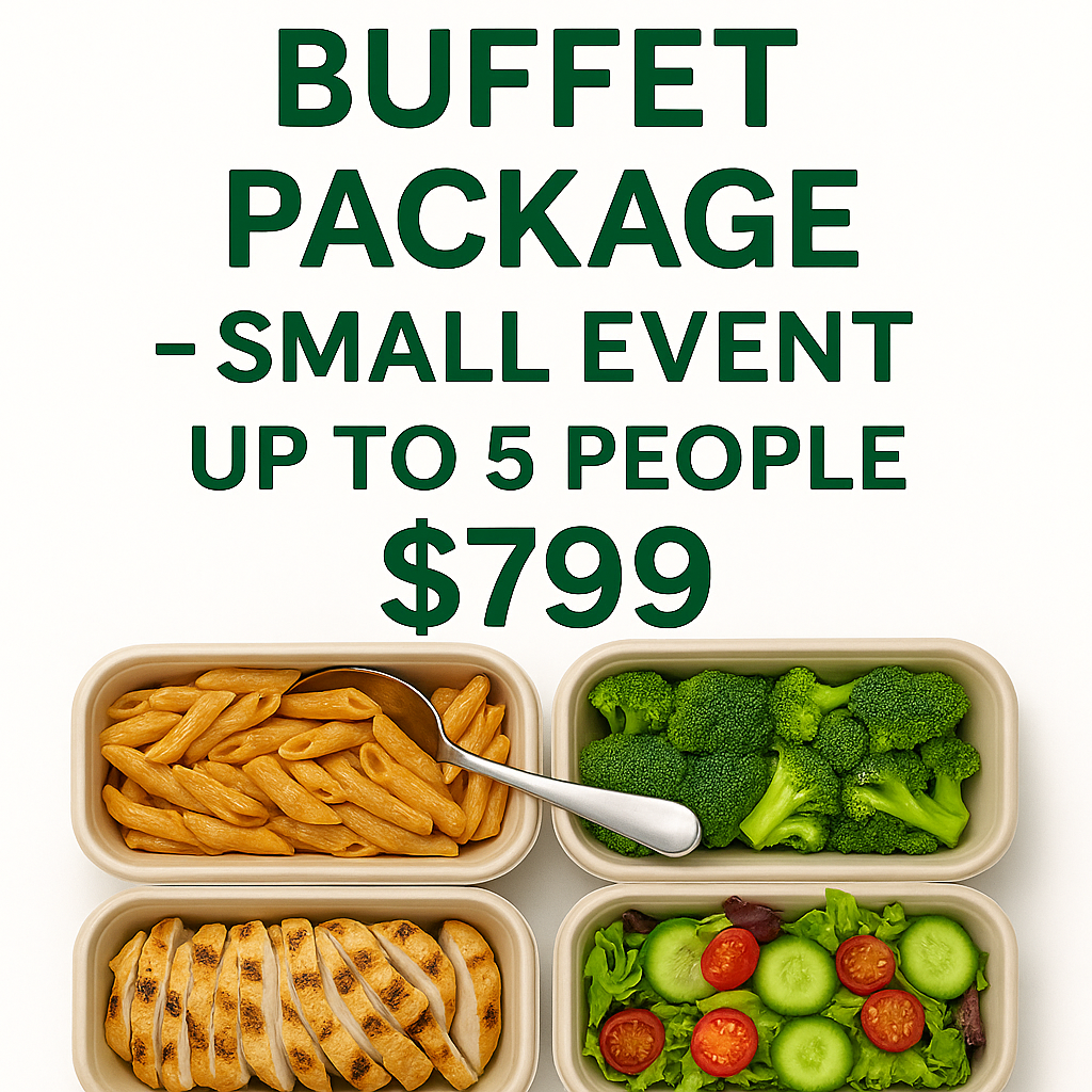 Ideal for office events, small parties, or training days. A full table with mains, sides, salads, and desserts. Includes setup-ready packaging.